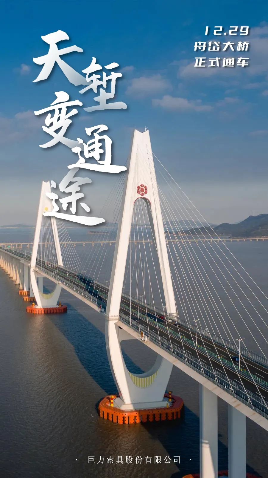 宁波舟山港主通道名目作为沪舟甬跨海大通道的主要构成局部,建成后与甬舟高速相连,使舟山连岛工程总扶植里程到达83千米,逾越8个岛屿,具有10座大桥,除舟岱大桥,巨力索具还承接了南通航孔桥、富翅门大桥、金塘大桥的斜拉索装置任务。