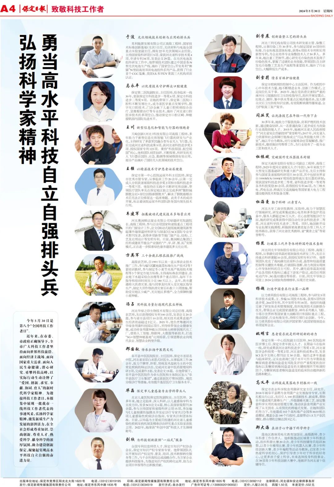 克日,保定市市委宣扬部、市迷信手艺协会、市科技局结合展开了2024年保定市“天下科技任务者日”评选勾当,经构造保举和评审专家委员会综合评选、公示,巨力索具股分无限公司党总支布告、总裁杨超荣获“最美科技任务者”称呼。