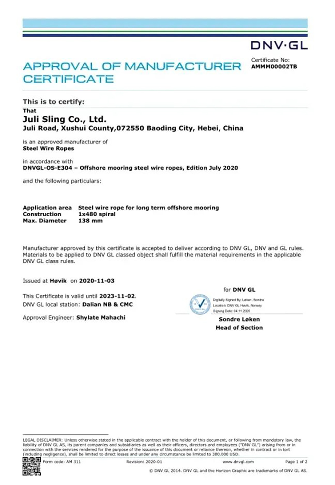 2020年11月,巨力索具获得了永远系泊用单股涂塑钢丝绳的DNV·GL工场承认证书,成为国际首家经由过程该类钢丝绳DNV·GL工场承认的厂家。