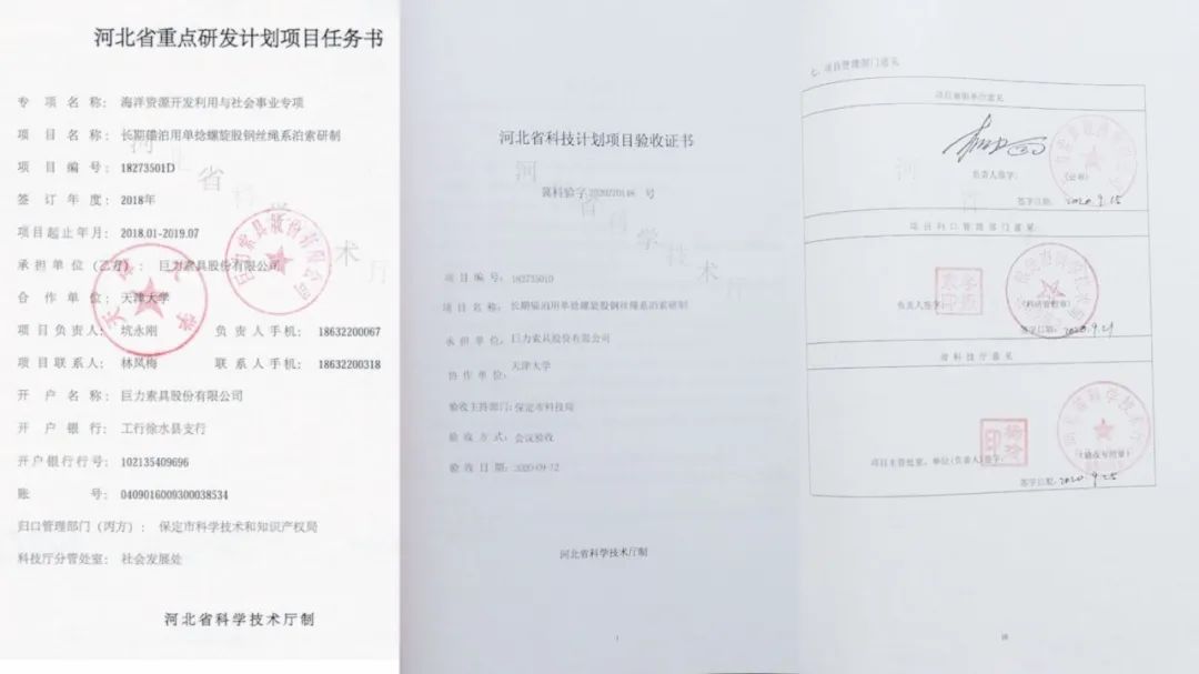 2020年9月12日,巨力索具“持久锚泊用单捻螺旋股钢丝绳绳系泊索研制”经由过程了河北省科技厅构造的验收,名目实现了持久锚泊系泊索索体、闭式浇铸讨论、曲折限定器的产物研发,构成了系泊索集成设想,集成配套的才能。